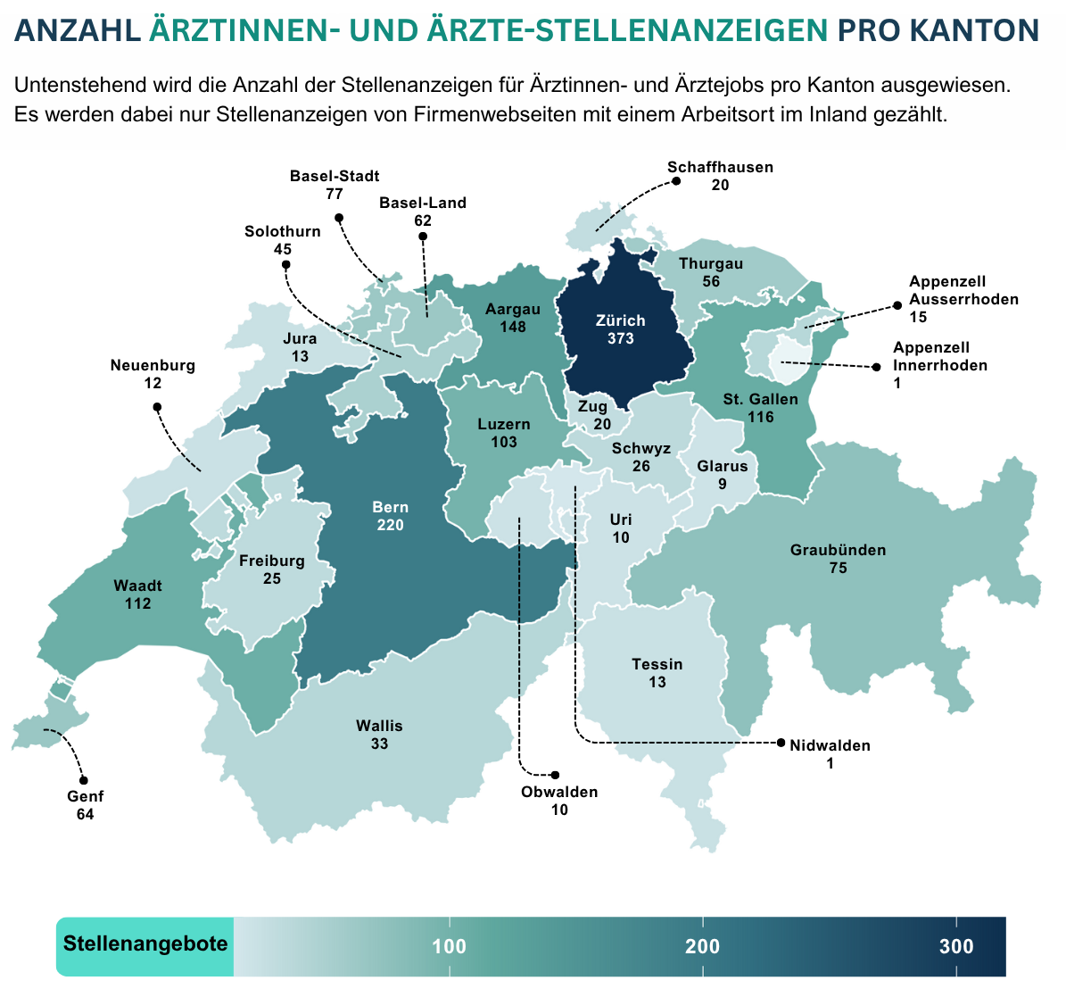 Untenstehend wird die Anzahl der Stellenanzeigen für Ärztinnen- und Ärztejobs pro Kanton ausgewiesen. Es werden dabei nur Stellenanzeigen von Firmenwebseiten mit Arbeitsort im Inland gezählt. Ein Blick auf die kantonale Verteilung der offenen Ärztinnen- und Ärztejobs (Abb. 1) zeigt deutliche Unterschiede.