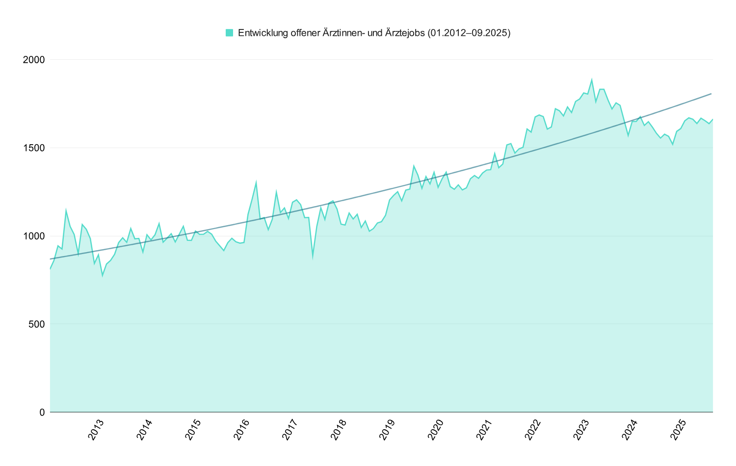 Die Kurve zeigt zwar leichte Schwankungen, insbesondere während der Pandemiejahre 2020 bis 2022, doch der übergeordnete Trend bleibt konstant steigend. Der lineare Trendverlauf verdeutlicht, dass der Fachkräftebedarf im ärztlichen Bereich langfristig zunimmt – ein Zeichen für strukturelle Engpässe, die sich nicht allein durch konjunkturelle Effekte erklären lassen.