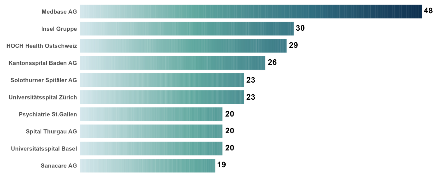 Ebenfalls unter den grössten Arbeitgebern befinden sich das Kantonsspital Baden AG (26), die Solothurner Spitäler AG (23) sowie das Universitätsspital Zürich (23). Knapp dahinter liegen die Psychiatrie St. Gallen (20), die Spital Thurgau AG (20), das Universitätsspital Basel (20) und die Sanacare AG (19).