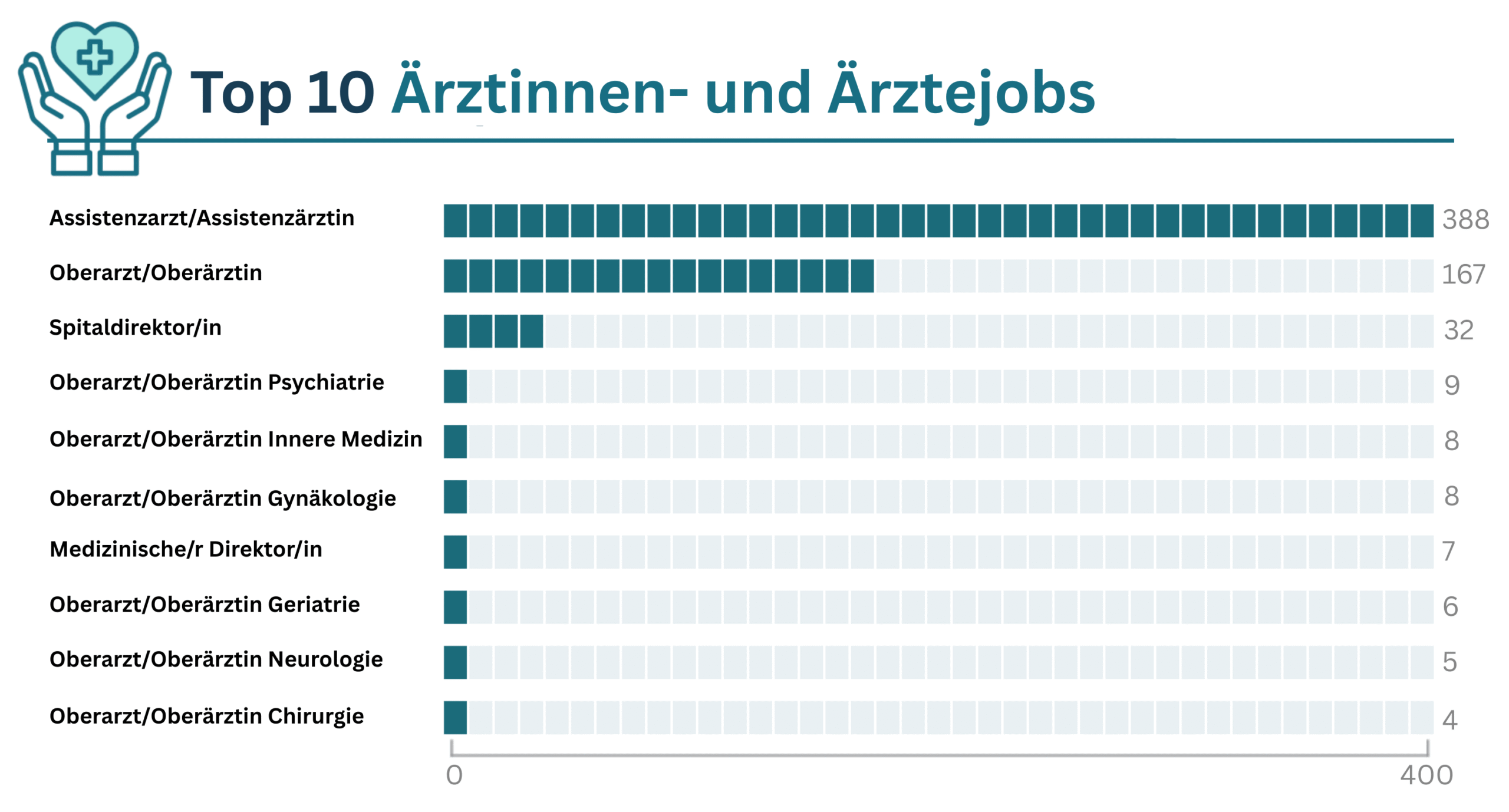 An zweiter Stelle folgen Oberärztinnen und Oberärzte mit 167 offenen Stellen, gefolgt von leitenden Funktionen wie Spitaldirektorinnen und -direktoren (32) und medizinischen Direktorinnen und Direktoren (7).