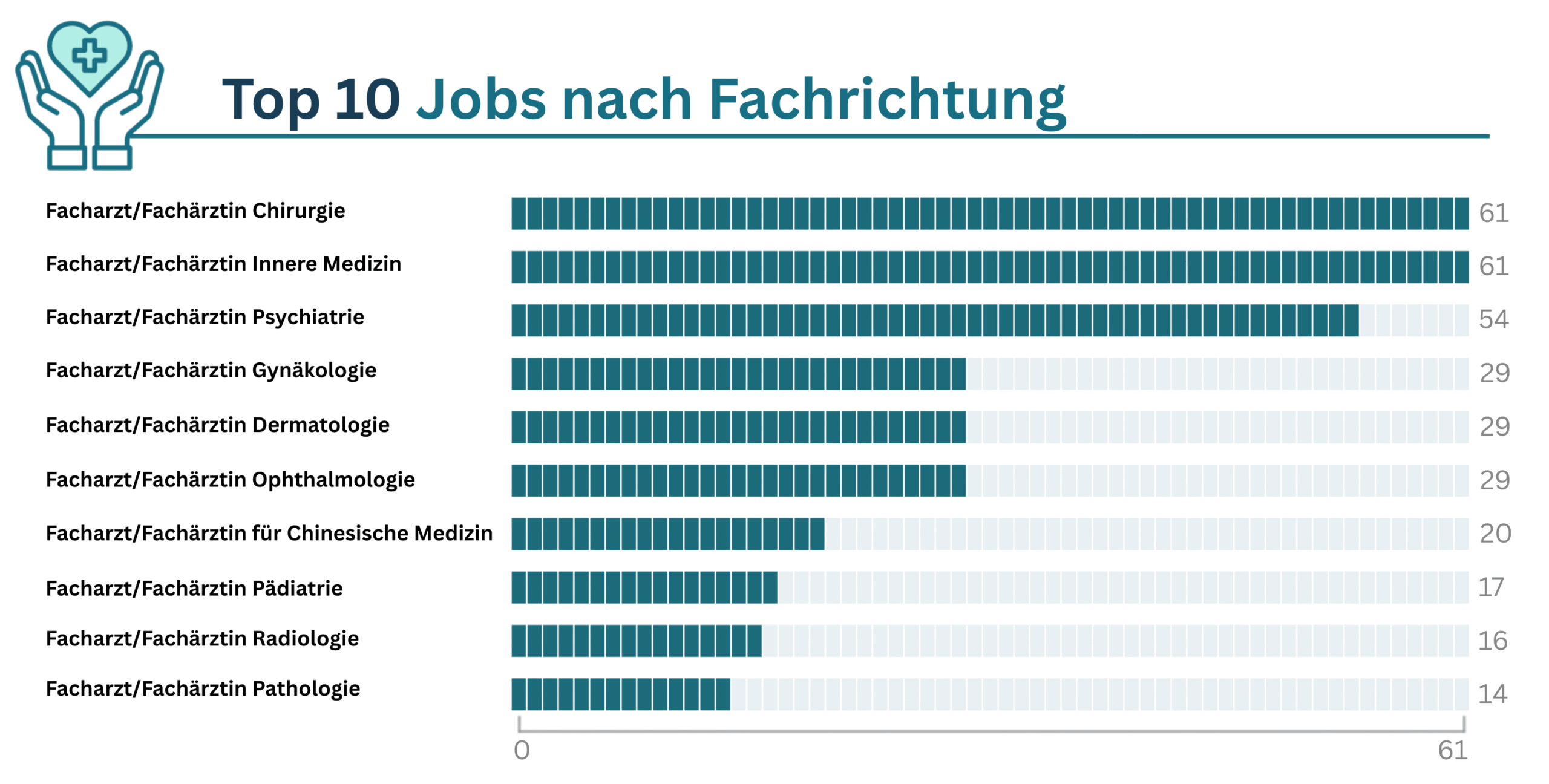 Diese Zahlen verdeutlichen, dass die hohe Fachkräftenachfrage im ärztlichen Bereich insbesondere grosse Spitäler und Gesundheitsnetzwerke betrifft – Organisationen, die durch ihre Grösse und Spezialisierung einen konstant hohen Personalbedarf haben. Gleichzeitig zeigt sich, dass auch private Gesundheitsanbieter zunehmend stark auf dem Arbeitsmarkt auftreten.