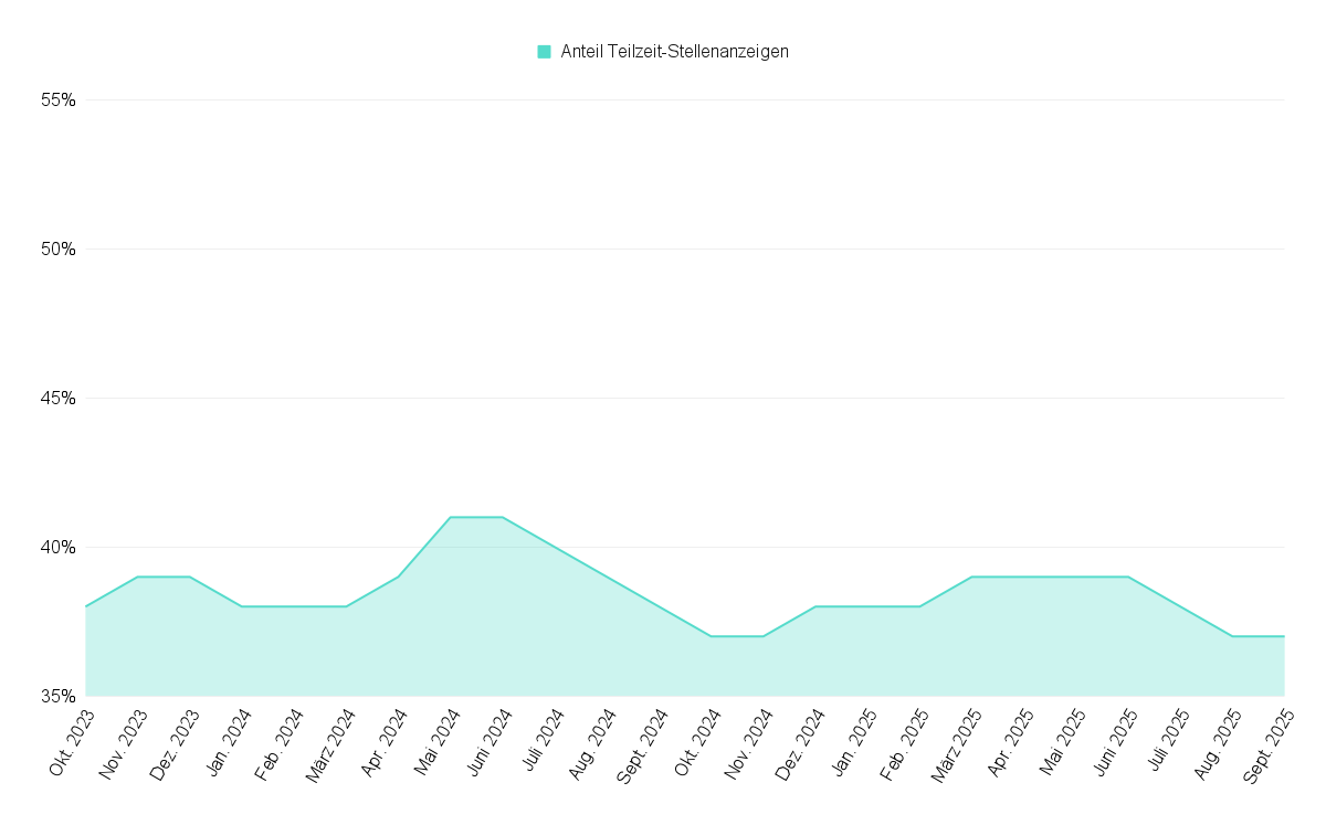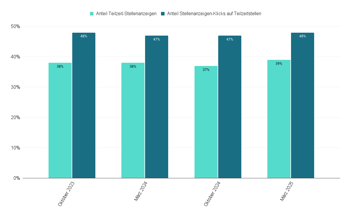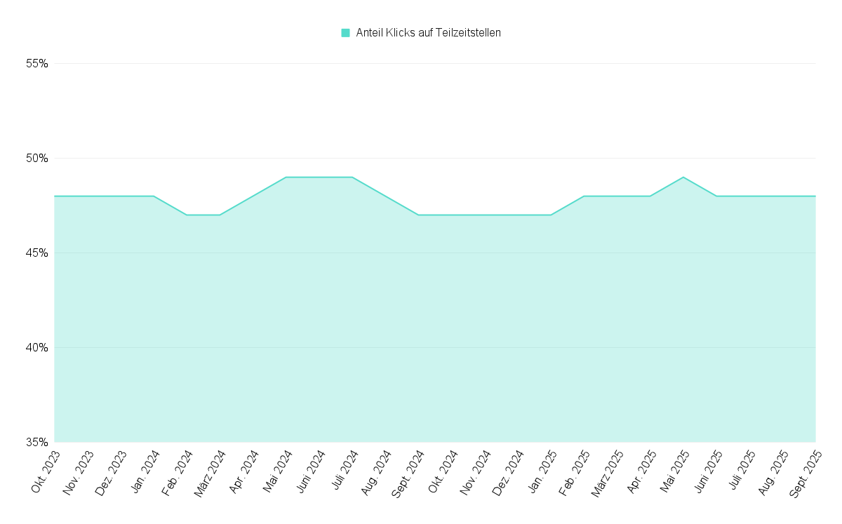 Die Nachfrage nach Teilzeitarbeit seitens der Arbeitnehmenden hat sich in den letzten Jahren auf einem dauerhaft hohen Niveau stabilisiert. Aktuell entfallen rund 50% aller Stellenanzeigen-Klicks auf Teilzeitangebote. Das zeigt: Jobsuchende suchen nach Arbeitszeitmodellen, die ihnen mehr Flexibilität und bessere Vereinbarkeit von Beruf und Privatleben ermöglichen.