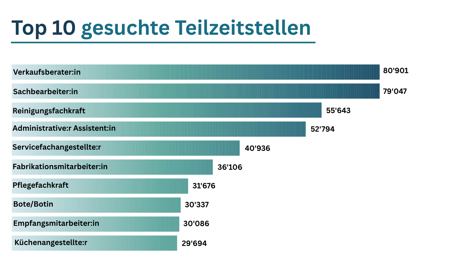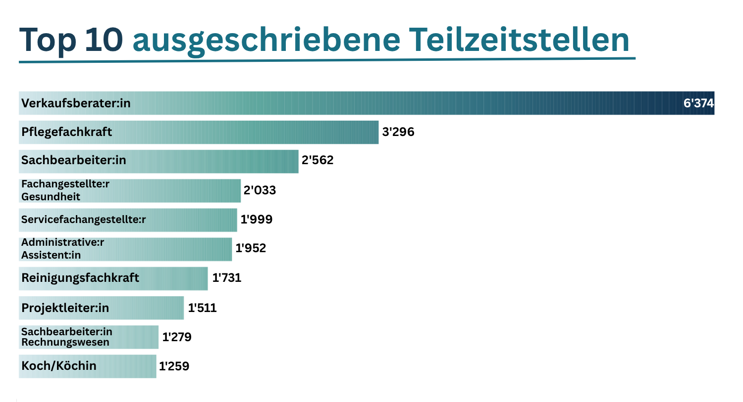 Aktuell wird der Beruf Verkaufsberater:in am häufigsten als Teilzeitstelle ausgeschrieben, mit einem deutlichen Vorsprung von über 1’000 Inseraten gegenüber der zweitplatzierten Pflegefachkraft.